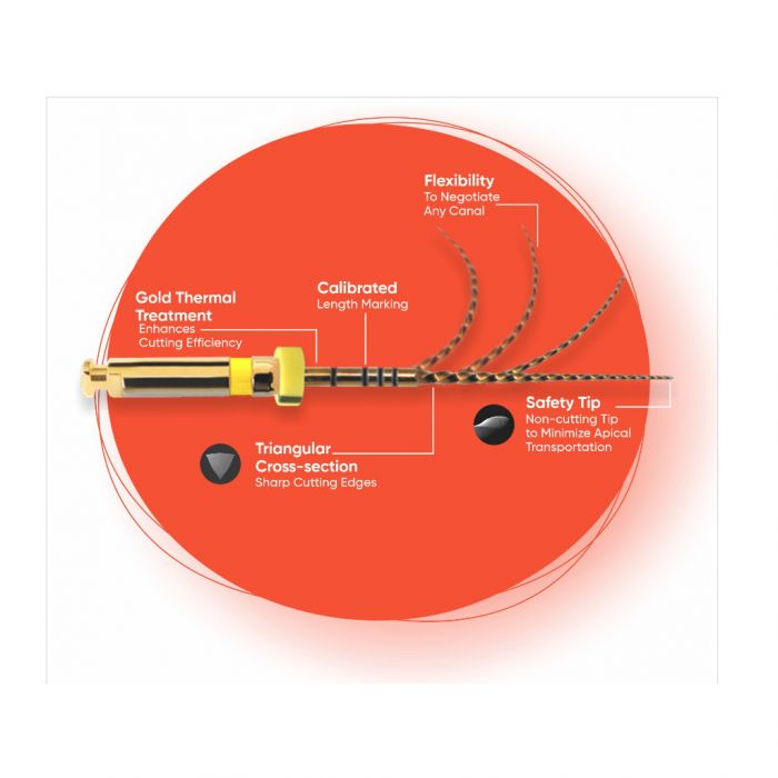 Enhanced cutting efficiency due to Gold Thermal Treatment. Triangular cross-section with sharp cutting edges. Non-cutting tip minimizes apical transportation. Specialized heat treatment methods ensure stable flutes and high flexibility.