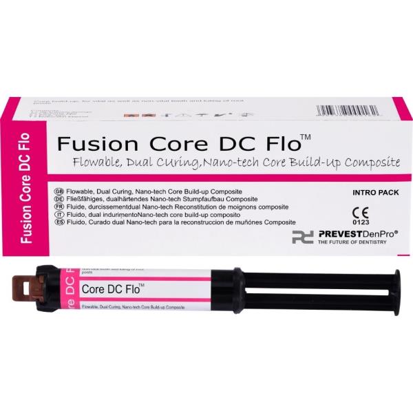 Fusion Core DC Flo is a dual cure, radiopaque, two component, core build-up material in a convenient automix delivery syringe. This material flows conveniently, yet stacks without slumping, thus offering easy placement. The dual cure formulation allows complete curing.